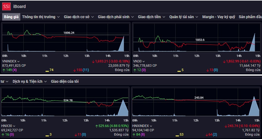 Thị trường Chứng khoán Việt Nam (VN-Index) có dấu hiệu tạo đáy khi biến động trong biên độ hẹp với vai trò đỡ chỉ số của nhóm vốn hóa lớn. Kết phiên giao dịch 16/3, VN-Index dừng ở 1.693,21 điểm, giảm 3,03 điểm – tương đương 0,18% so với mở