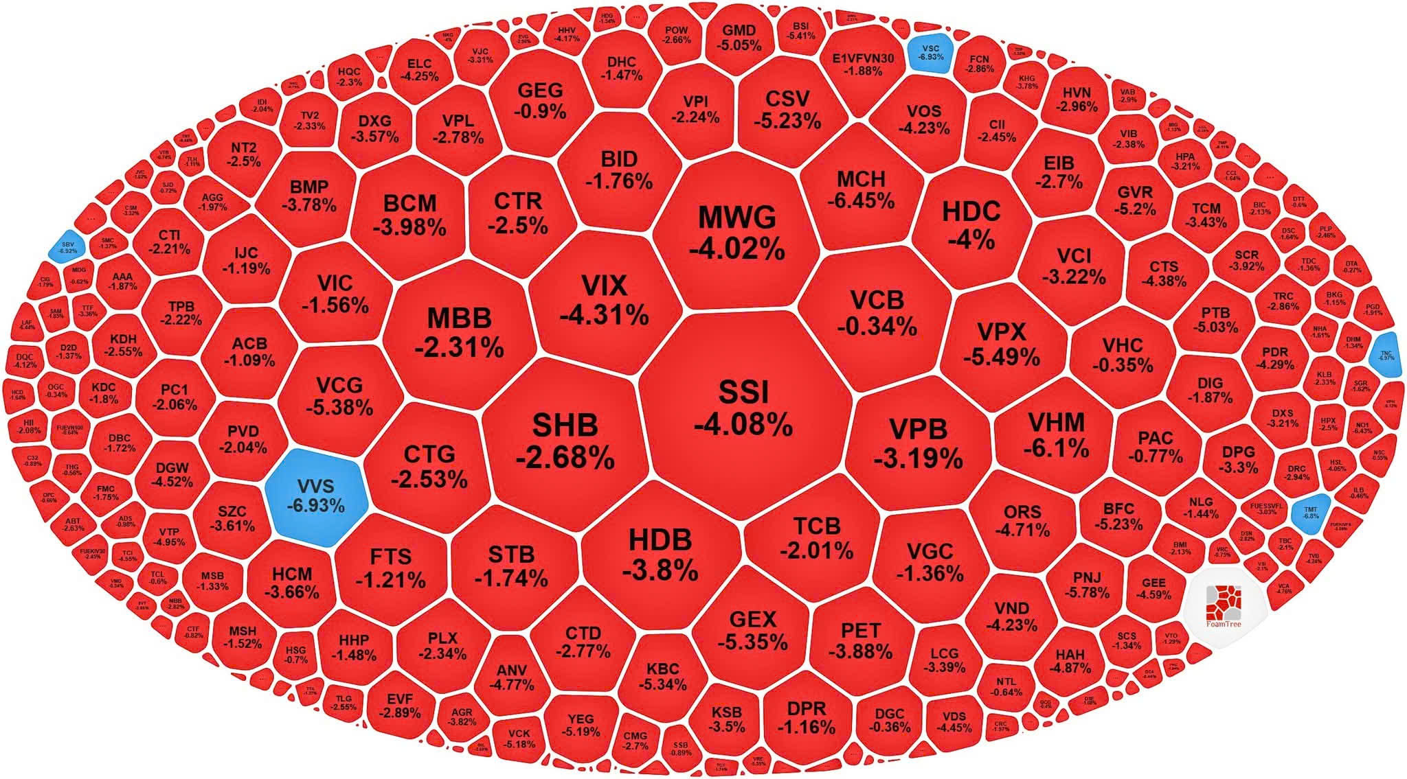 Kết phiên giao dịch, VN-Index về vùng 1.591,17 điểm, giảm 56,64 điểm – tương đương 3,44%. Đây là lần đầu tiên kể từ tháng 11/2025 chỉ số VN-Index chạm vùng 1.500 điểm. Thống kê cho thấy, toàn thị trường có đến 676 mã cổ phiếu chìm trong sắc đỏ. Trong