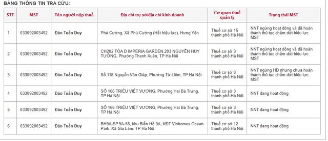 Về loại hình hộ kinh doanh, theo dữ liệu của Cục Thuế, hiện 3 địa điểm kinh doanh đứng tên ông Đào Tuấn Duy đã ngừng hoạt động. Trong đó, 2 địa điểm tại Phú Cường, Xã Phú Cường, tỉnh Hưng Yên và CH202, Tòa D Imperia Garden, 203 Nguyễn Huy Tưởng, phường Thanh Xuân, TP Hà Nội đã hoàn thành thủ tục chấm dứt hiệu lực mã số thuế.